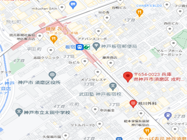 周辺地図 Be-skin 〒654-0024 神戸市須磨区大田町3-4-2 TEL.078-735-3050 アクセス 電車の場合 地下鉄板宿駅 南口徒歩3分 山陽電鉄板宿駅 徒歩5分 自動車の場合 北側に駐車場2台分あり